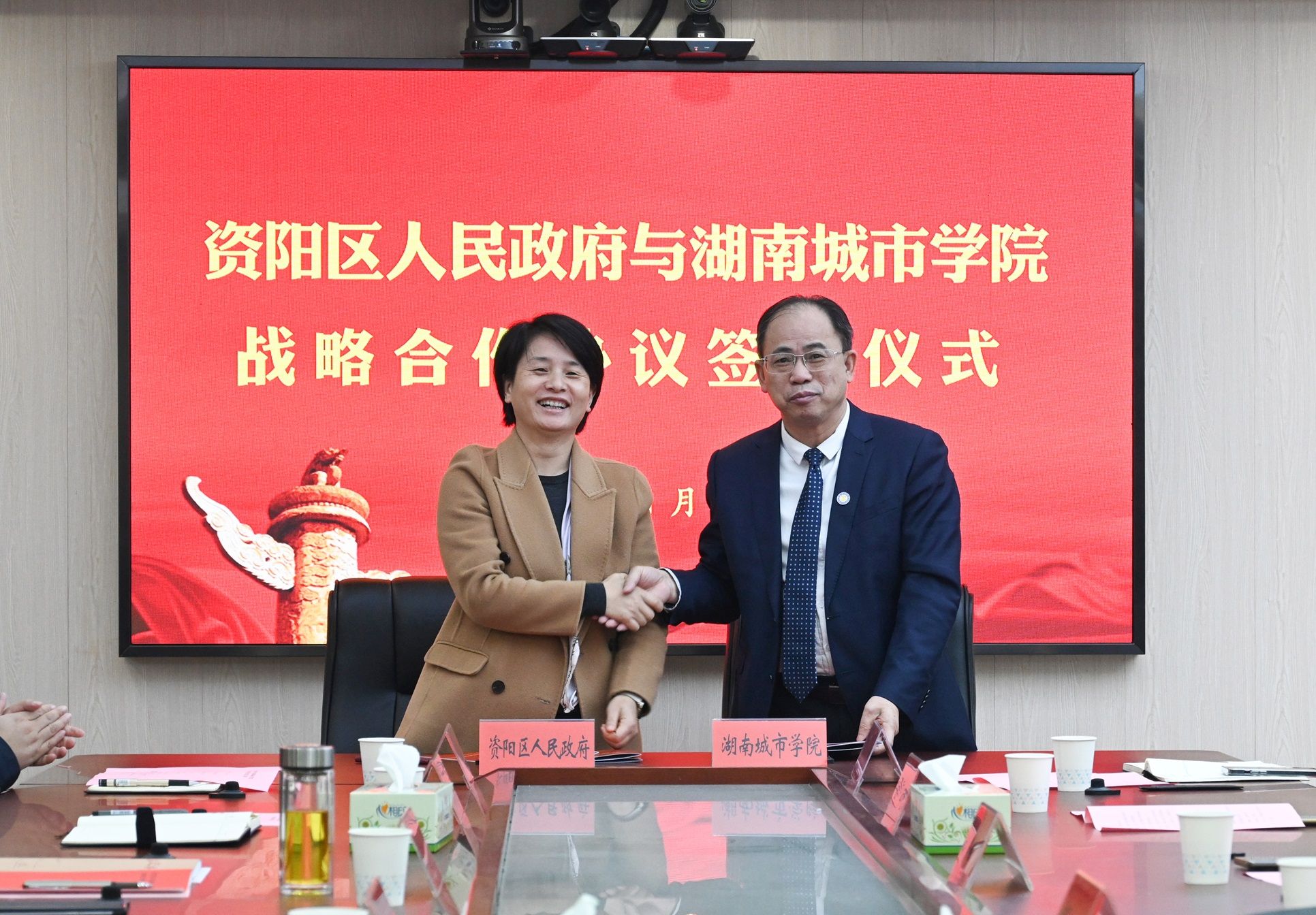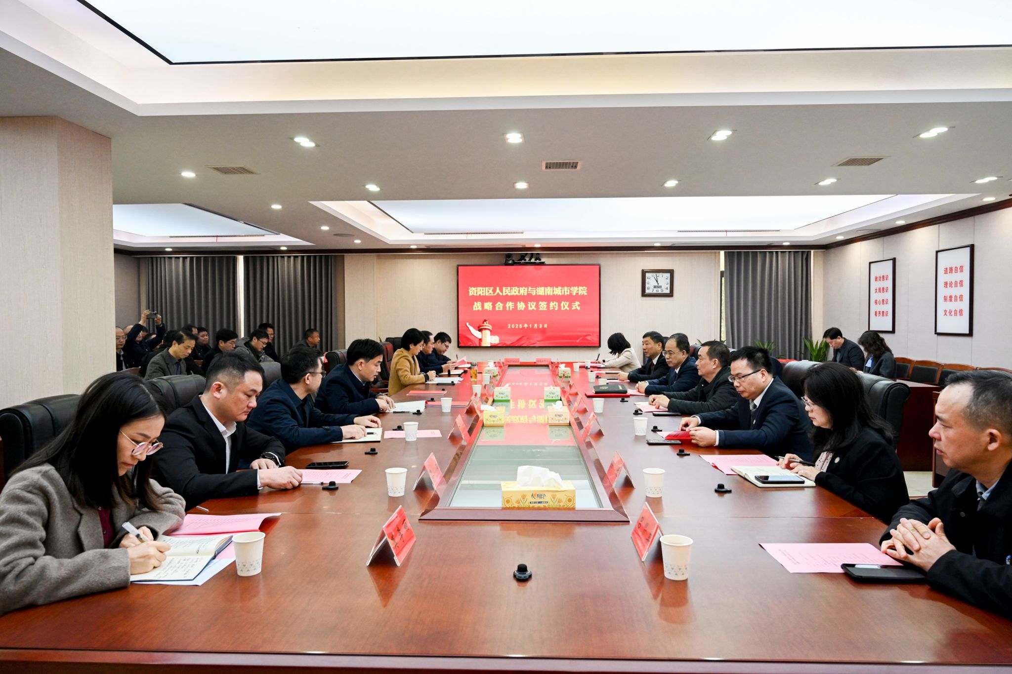校长何振介绍了学校基本情况、办学成绩及产学研、校政企合作情况。他表示,学校与资阳区此次深化城镇化体系构造、项目建设、园区建设、乡村振兴等方面的全方位的合作,是实现优势互补、深化融合、互利共赢的创新之举、务实之举、担当之举。今后,学校将与资阳区人民政府携手共进,在品牌共用、资源共享、区校共管、人才共育、特色共创等方面开展深度合作,全力打造校地创新合作成功典范。
