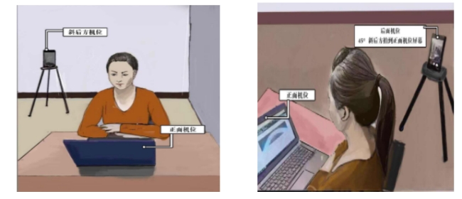 (2)第二机位的设备使用钉钉APP。放在考生侧后方约45度,确保能够拍摄到考生本人、考试环境及正面机位屏幕。
