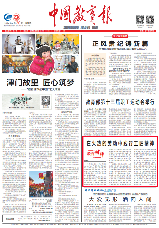 本网讯 4月30日,《中国教育报》头版发表Ky开元党委副书记袁志成的评论员文章《在火热的劳动中践行工匠精神》。全文如下: