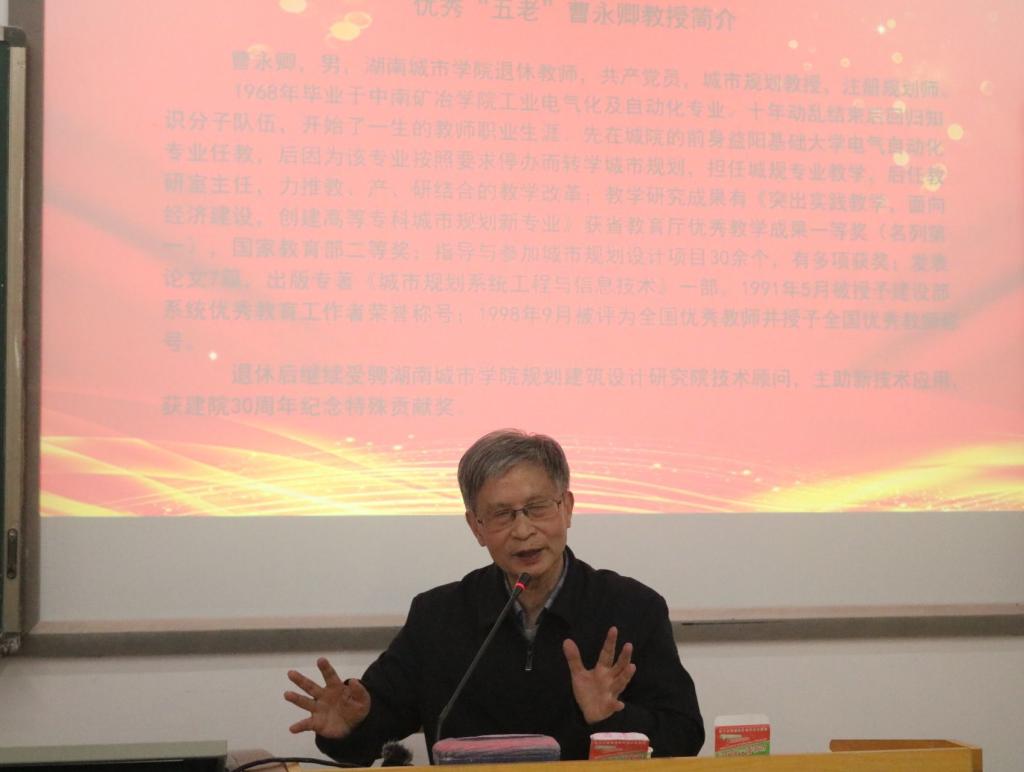 曹永卿,城市规划教授,注册规划师。1991年5月被授予建设部系统优秀教育工作者荣誉称号;1998年9月被评为全国优秀教师并授予全国优秀教师称号。退休后继续受骋Ky开元集团规划建筑设计研究院技术顾问,主助新技术应用,获建院30周年纪念特殊贡献奖。曹永卿教授以“不忘初心,砥砺前行-我的教书育人”为题分享了个人成长奋斗的经历,勉励青年学生脚踏实地,努力奋斗,实现人生价值。