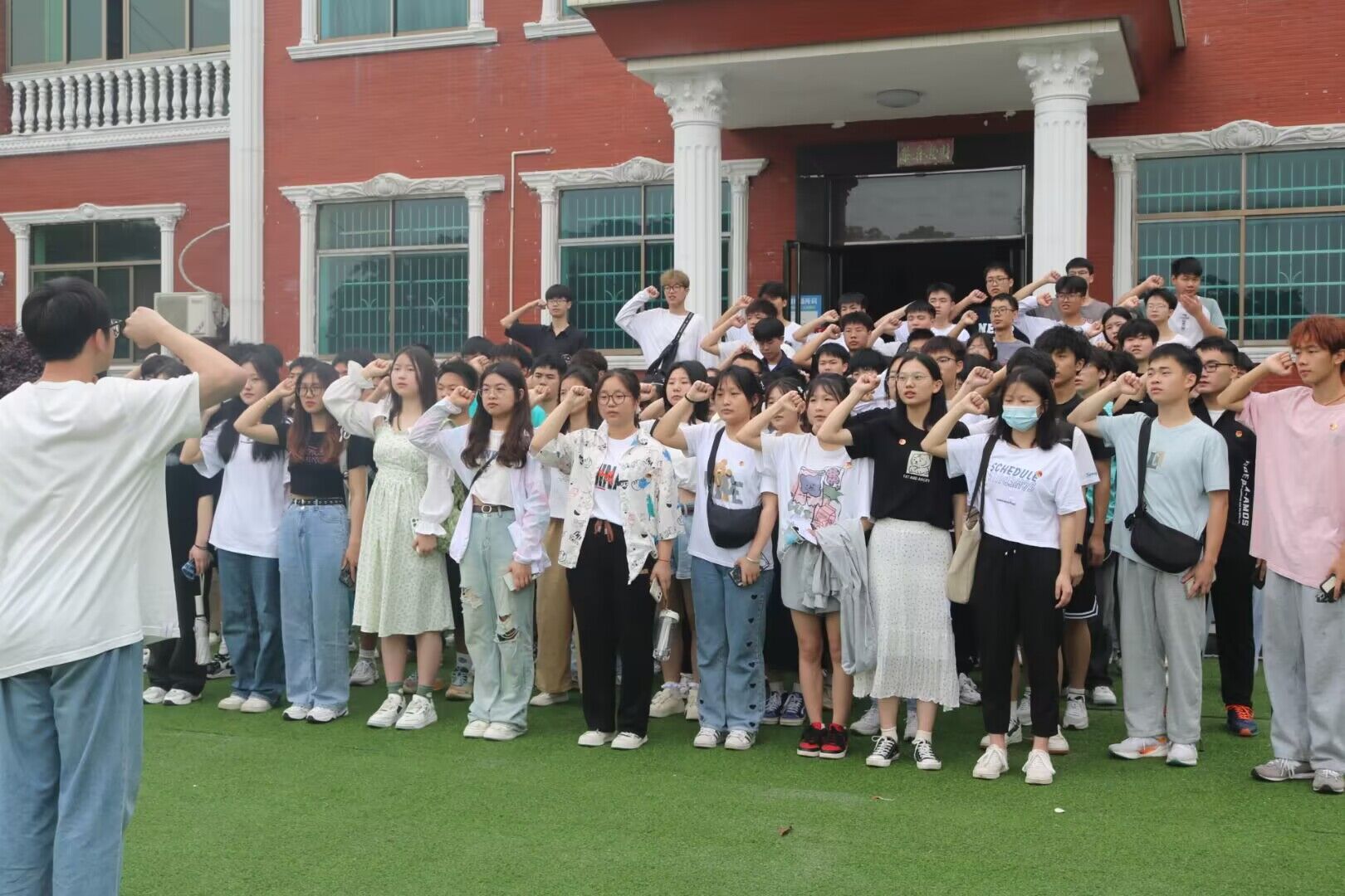 全体师生合唱团歌,激昂的旋律振奋着大家的精神,嘹亮的歌词唱出青年奋进新时代的决心和信心。
