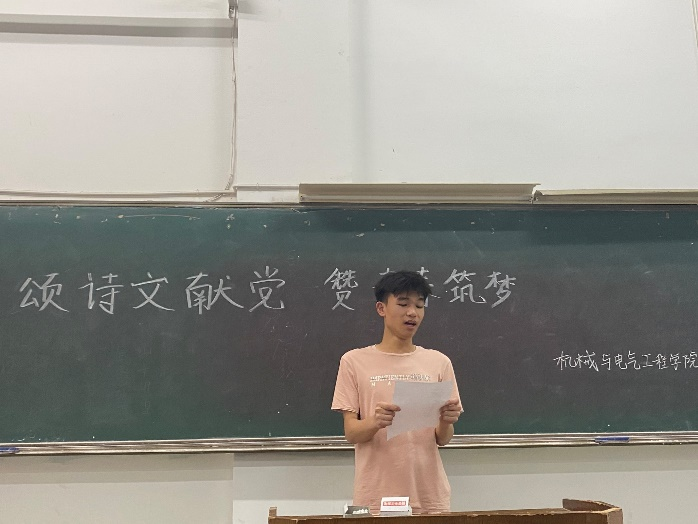 2021年正值建党100周年,为了歌颂党的伟大成就,增强同学们爱党爱国之情,提高当代大学生的政治觉悟,丰富当代大学生的课余文化生活机械与电气工程学院于2021年5月9日在一教110教室举行颂诗文献党,赞青春筑梦”诗文朗诵比赛此次比赛的评委有机械与电气工程学院团委、学生会执行主席胡皓宇、学习部部长林逸翔、学习部副部长赖琪、办公室部长邓功涛和办公室副部长扶轩程