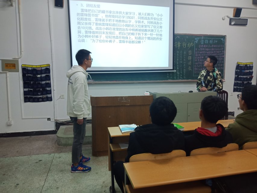 2019年3月5日晚上7点,2018级各班同学于教学楼举行了关于学习雷锋的主题班会和政治学习。