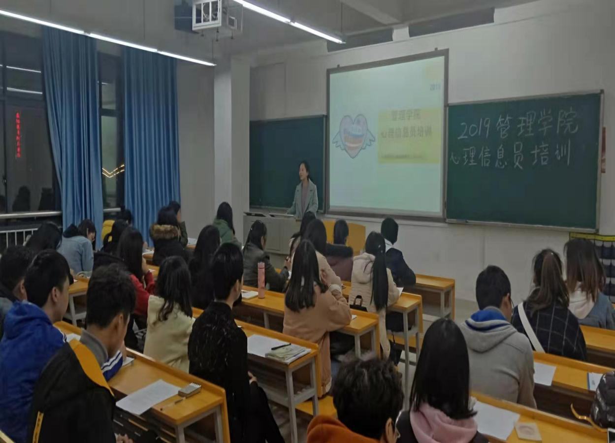 2019年3月13日星期三晚上19点,在管理楼210教室召开了管理学院2019年上学期第一次心理信息员培训。本次培训针对管理学院16、17、18级各班的心理信息员展开,由辅导员张力老师担任讲主讲人,辅导员曹资立老师出席了本次培训。