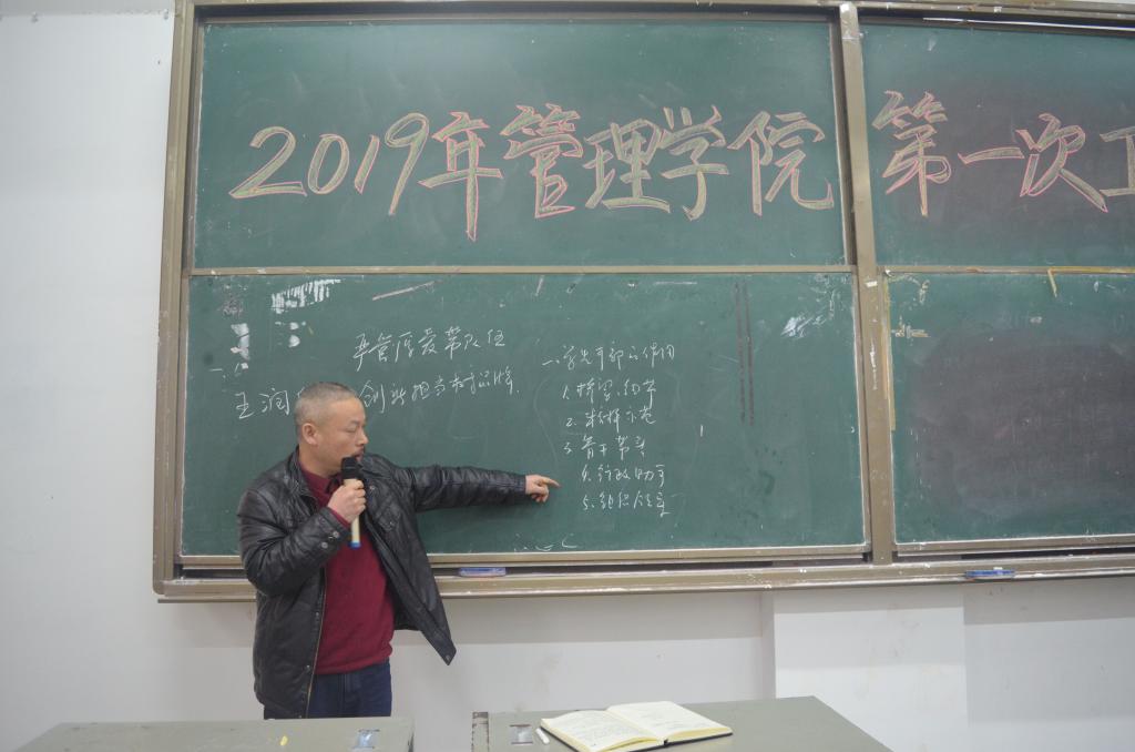 管理学院党委副书记蔡英杰老师对新学期学生入学情况摸底进行部署要求,强调要重视学生党性教育,坚定的理想信念,提升自己的学习成绩。曹资立老师就学生干部的管理及要求做出了指导,并教导学生干部们正确处理好个人与集体、学习与生活等关系。管理学院学生工作办公室主任王方俊老师强调了寝室和个人安全等问题。管理学院分团委书记李姗老师介绍了党建工作的相关事项,鼓励学生干部们努力学习,积极入党推优。辅导员熊鹏飞对本学期分团委学生会工作安排作了具体安排,对学生干部提出了具体要求,辅导员张力以“学风建设”为主题发表讲话,对上学年各年级的成绩进行了汇总说明,同时针对考研情况和英语四六级通过率进行分析。管理学院党委副书记王润华老师对此次学生干部工作会议做了总结,明确了学生干部的重要性,阐述了如何做好一名学生干部,对学生干部提出了殷切希望和要求。