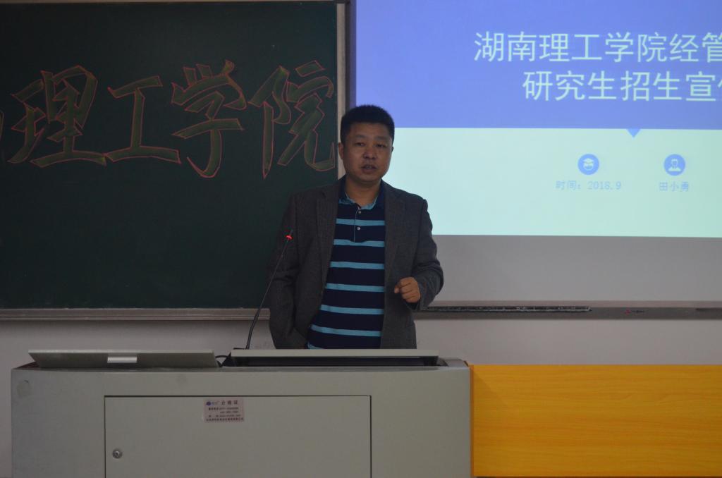 2018年9月27日15:10,湖南理工学院硕士招生活动在管理楼306顺利召开。本次活动的主讲人是湖南理工学院教授田小勇,出席活动的嘉宾有管理学院分团委书记李姗和辅导员张力,管理学院部分大三大四学生按时到场与会。