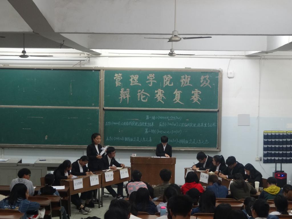 2017年10月27日晚7:00管理学院班级辩论赛复赛于1-204、1-206顺利开展。出席本次辩论赛复赛的评委有管理学院辅导员张力、分团委副书记张闪、学生会主席曾文烨、副主席邓圆圆、李志俊、晋雪莹、刘熠琛、郭子豪。