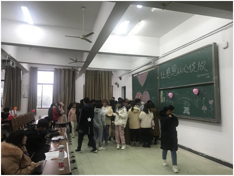 开场结束后,大家在主持人的组织下用便利贴写下自己心里想说的话,贴到黑板上的大爱心中;邀请参与同学到讲台上朗诵一些有关感恩的名人典故。以增强同学们对感恩的理解。