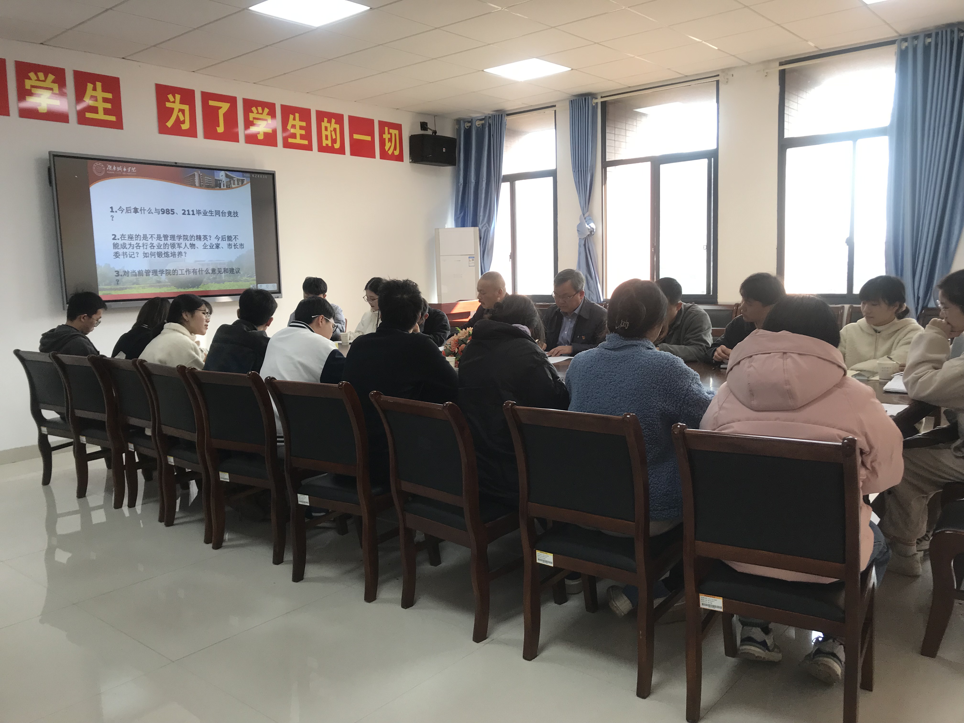 会议第二项,学生干部代表就Ky开元学生与其他985、211高校毕业生之间的差距及对学院管理工作的意见和建议进行了简要发言。学生干部提出,普通大学毕业生与985、211大学毕业生在学业水平、就业机会、职业成长空间、薪资待遇等诸多方面均有差距。因此我们需要有健康的身体、扎实的专业知识、强烈的责任心、良好的协调沟通能力和实干精神、志存高远、胸怀宽阔的格局才能与之同台竞技。