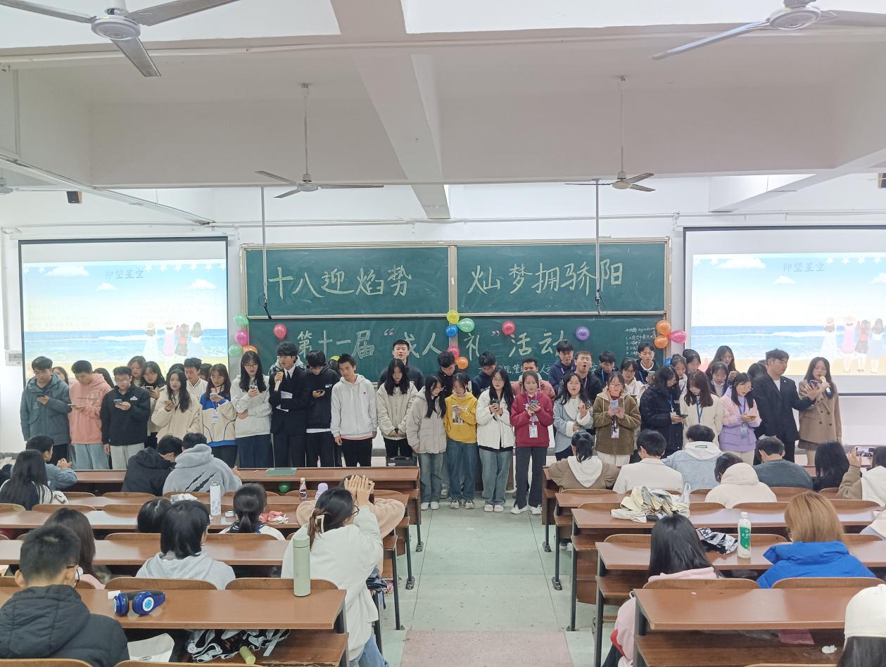 十八迎焰势,灿梦拥骄阳。为了让学生们充分认识到跨入十八岁成人行列的意义,管理学院联合人文学院和信息与电子工程学院于11月12日上午8时30分在一教207举办第十一届成人礼活动。
