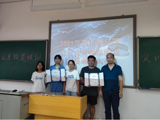 2021年9月16日下午,管理学院经济财务系在管理楼207教室举行“2021年第八届全国证券投资与模拟实训大赛”颁奖大会。自今年3月开赛以来,经济财务系同学们在周密老师指导下,从7万余参赛大学生中突出重围,先后4个月历经初赛和国家决赛,喜获团队一等奖1名、团队二等奖2名、团队三等奖3名、个人一等奖2名、个人二等奖1名、个人三等奖1名的优秀名次。颁奖大会由经济财务系周密老师主持,管理学院副院长赵旭教授、经济财务系系主任黄新教授、经济财务系封彦老师出席大会并分别给获奖同学代表颁发证书。赵旭副院长代表学院致辞,对获奖学生表示祝贺,希望同学们能继续积极参加学科竞赛,带领学弟学妹们在未来的学科竞赛中取得更好成绩,也感谢周密老师在学科竞赛指导中的努力和付出!最后大家集体合影留念。