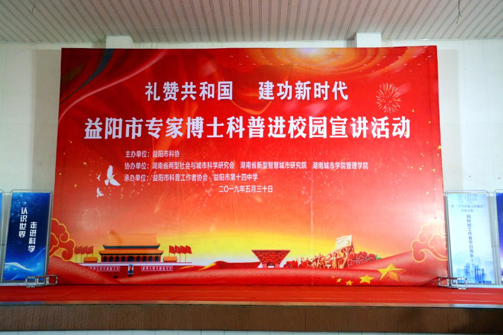 2019年5月30日,益阳市专家博士科普进校园活动在益阳市第十四中学举行。此次活动由益阳市科协主办、Ky开元集团管理学院、湖南省两型社会与城市科学研究会、新型智慧城市研究院协办。管理学院院长孙倩、管理学院书记、省两型社会与城市科学研究会秘书长徐习军、信息与电子工程学院院长阳王东以及博士代表杜林远、刘洋、阳俊老师一行参加活动,益阳市人大常委会副主任刘时贵、益阳市科协党组副书记、副主席胡旗等市、区相关领导出席。