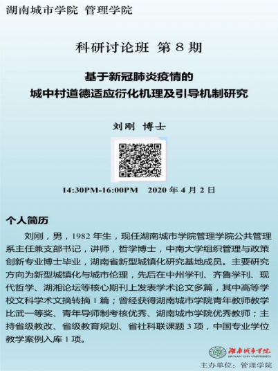 本次科研讨论班邀请了Ky开元集团学科建设与发展规划处副处长汤勇教授主持,学院院长孙倩教授、科研副院长赵旭教授及管理学院教师共23人参加。本次科研讨论班由“城乡治理与工程管理”团队负责人任国平博士组织,“行政伦理与公共管理”团队负责人刘刚博士主讲。刘刚博士结合当下疫情和自身研究方向,选择《基于新冠肺炎疫情的城中村道德适应衍化机理及引导机制研究》为主题,探讨新冠肺炎疫情下城中村居民道德适应的范式转化、衍化机理,为新冠疫情下的城中村居民城市适应进行慎的伦理反思和道德辩护。讲座期间管理学院多位老师就刘刚博士的研究问题进行了积极的讨论,取得了很好的反响。(通讯员:任国平)