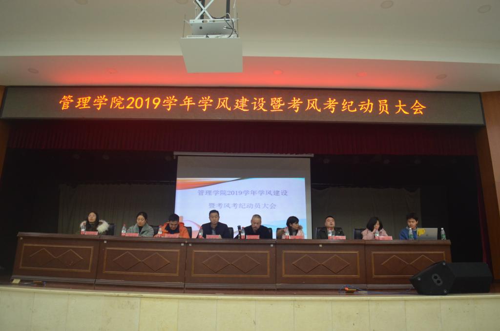 2019年12月29日19:30,管理学院2019学年学风建设暨考风考纪动员大会在大学生活动中心举行。学院党委副书记王润华、副院长李双清、全体辅导员老师、2019届全体学生、大二和大三各班学委、预备党员、入党积极分子、团学会主席团部长团成员参加了会议。
