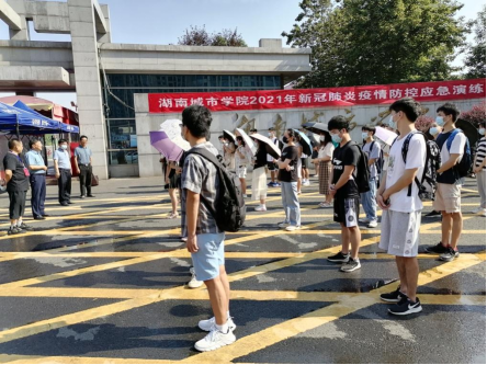 第一个场景为返校学生准备入校,在进校门前接受体温检测、随身行李消毒和健康码、行程码查验时,发现健康码为黄码,安保人员将其带到旁边临时隔离室,详细了解并填写基本信息,同时立即报告学校疫情防控办和相关学院,学校疫情防控办将情况立即报告学校疫情防控领导小组和羊舞岭社区,羊舞岭社区上报赫山区疾控中心后,安排专车接该生到赫山区集中隔离点采取进一步措施,通知学校卫生所协助消杀。