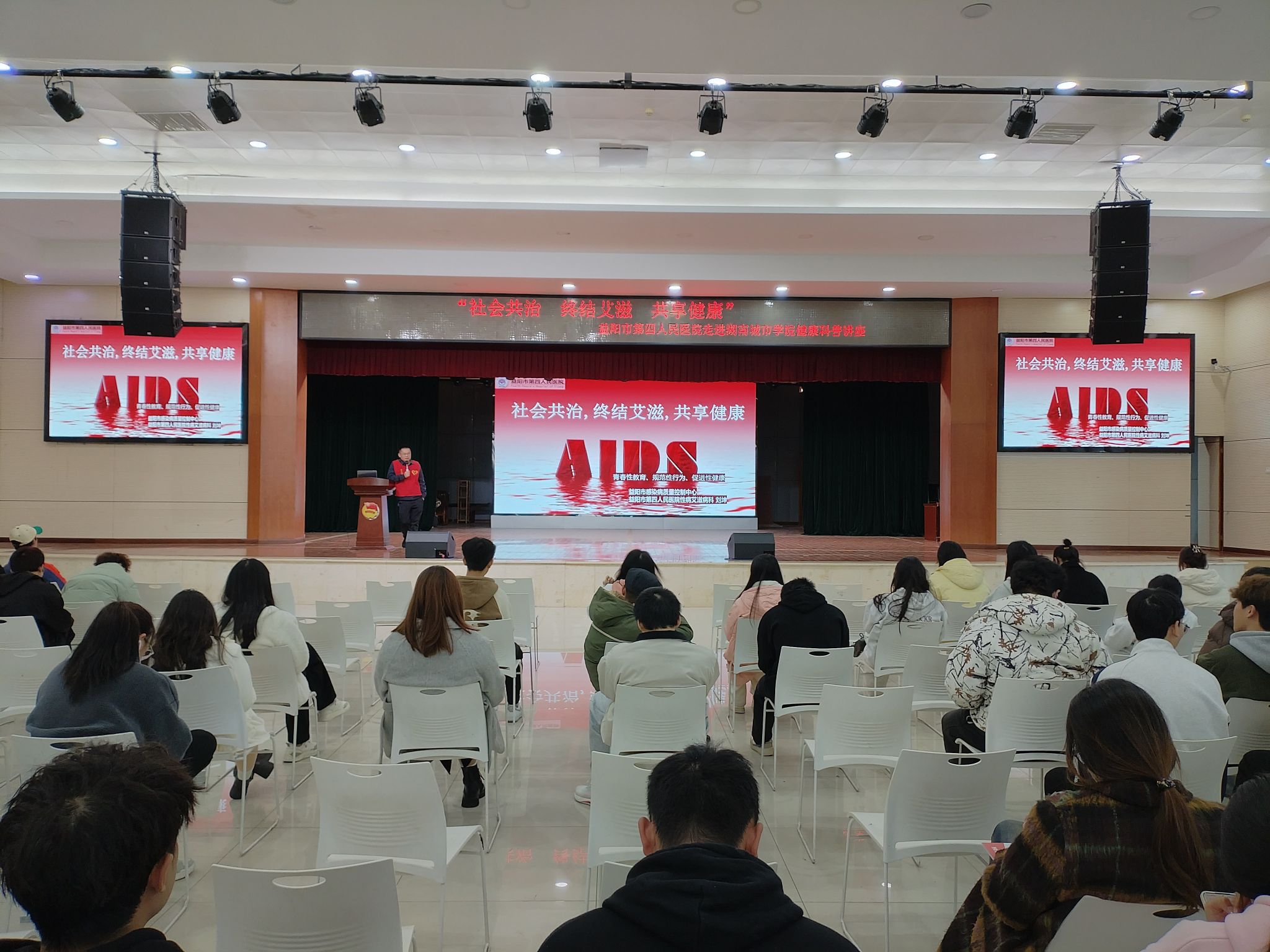 11月以来,通过现场讲座、发放宣传资料,利用科普展板、宣传横幅、宣传橱窗等在校园开展了以“防艾护青春,校园‘零艾’行”为主题的系列活动,广泛宣传艾滋病、性病和乙肝等传染病防治。活动期间,发放防治艾滋病宣传资料5000余份,为学生免费提供咨询和检测服务1000余人次。此次活动,还邀请了益阳市第四人民医院、益阳市赫山区妇幼保健院的专家分别作了《艾滋病的防治》《结核病与艾滋病的相互影响》《艾滋病、性病与乙肝的防治》的宣讲,通过有奖问答、现场咨询,为师生员工普及了艾滋病、性病与乙肝的流行病学、传播途径和防治等基本知识,为学校广泛持续开展艾滋病等传染病防治营造了良好氛围,为打造健康校园打下了牢固的基础。