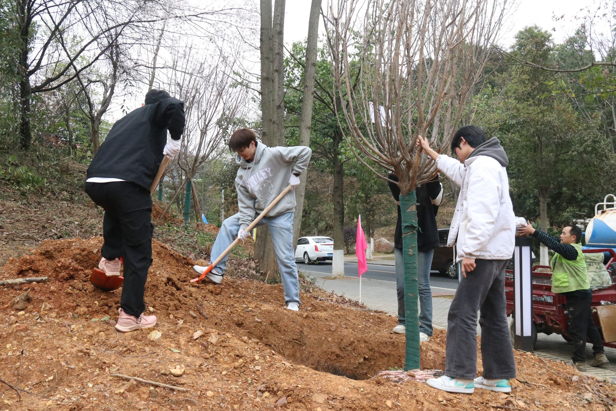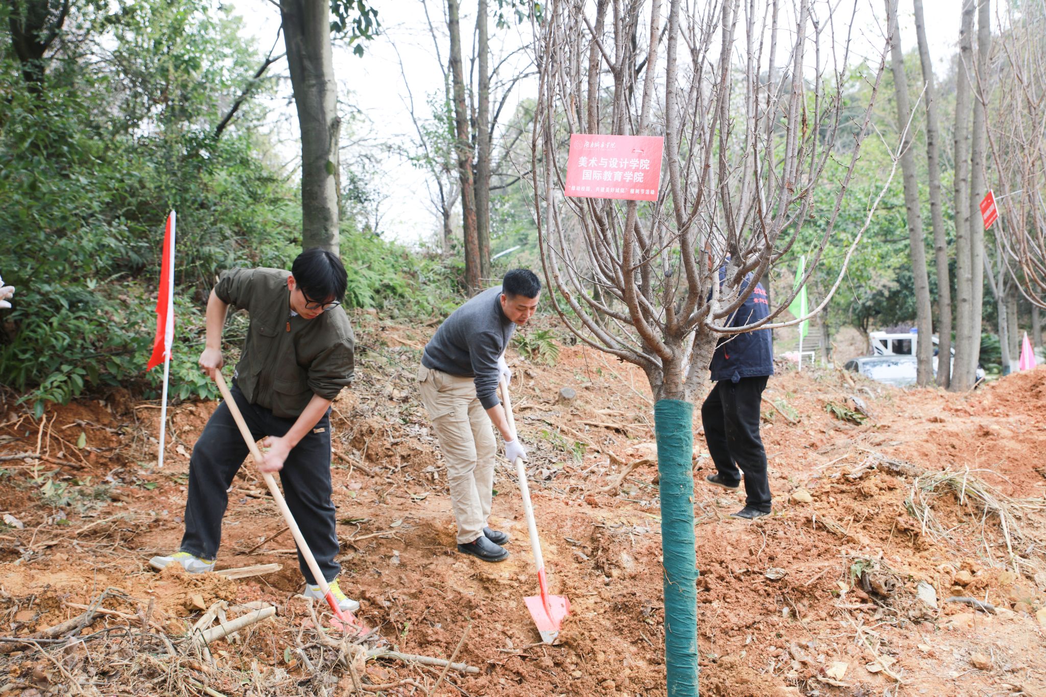 伴着三月的暖阳,师生们到达指定种植区域后,三五成组默契配合,挥锹铲土、栽植新绿、踩实修整、提桶浇水,现场一派热火朝天的劳动景象。经过一番辛勤劳动,一棵棵新种下的树苗昂然挺立,在春风的吹拂下焕发出勃勃生机,既为初春点染了一抹盎然的新意,也为校园增添了一道绚丽的风景。