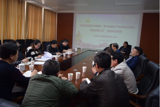 2019年3月28日下午,基建与后勤管理处党支部在二办公楼420会议室开展了“学习党支部工作条例,学习全面从严治党会议精神, 落实支部工作”主题党日活动。本次活动由党支书王建平主持,全体支部党员参加活动。
