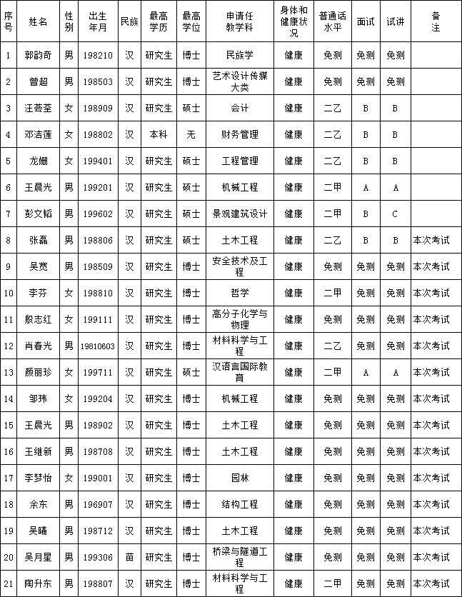 根据教育厅《关于做好2022年全省教师资格认定工作的通知》《关于进一步规范高校教师资格认定与管理工作的通知》的要求,经个人申报、专家审核、校长办公会审议,同意郭韵奇等21人申请2022年秋季批次高校教师资格认定,其中14人参加今年的岗前培训考试,待考试成绩在教育厅审批之前出来才能通过本次认定申请。现予以公示5个工作日,如有异议请在公示期内以书面形式反馈人事处。