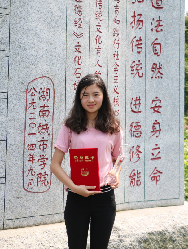 2014—2015学年国家励志奖学金;2015.08:第七届大学生广告大赛广播类全国优秀奖;2015.12:第七届大学生广告大赛广播类湖南省三等奖;2015.06:第七届大学生广告大赛策划类湖南省优秀奖;2014.04:大学生心理健康协会“心协之星”;2015.04、05:朋辈优秀主持人、五月心晴优秀主持人;2015.05:2014—2015学年“优秀共青团员”;2015.05:第26届党校培训“优秀学员”;2015.06:第七届大学生广告大赛校一等奖、校二等奖;2015.11:2014—2015学年综测一等奖;2015.11:2014—2015学年“三好学生”;2015.11:礼仪风采大赛“优秀工作者”。