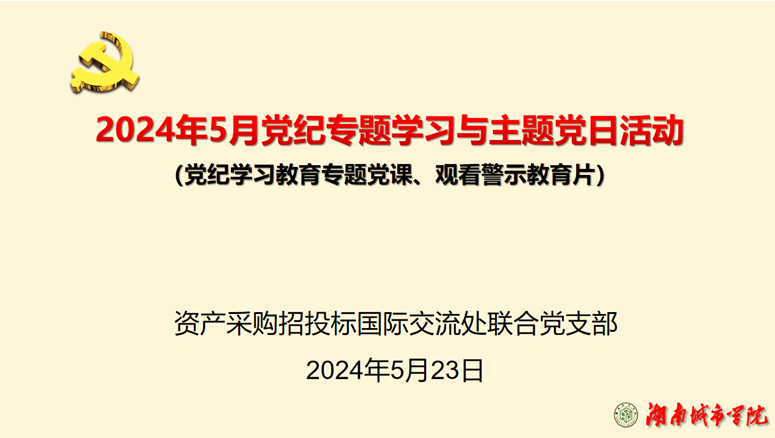 2024523日下午,资产处、采购与招投标管理中心、国际交流处联合党支部在一办公楼131室组织开展了党纪专题学习与主题党日活动,支部书记肖爱民主持,全体党员及资产处非党员一起参加。