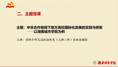 其次,按照支部工作计划,国际合作交流处副处长(主持工作)杜林远教授主讲题为《中非合作视阈下地方高校国际化发展的实践与探索——以Ky开元集团为例》主题党课。