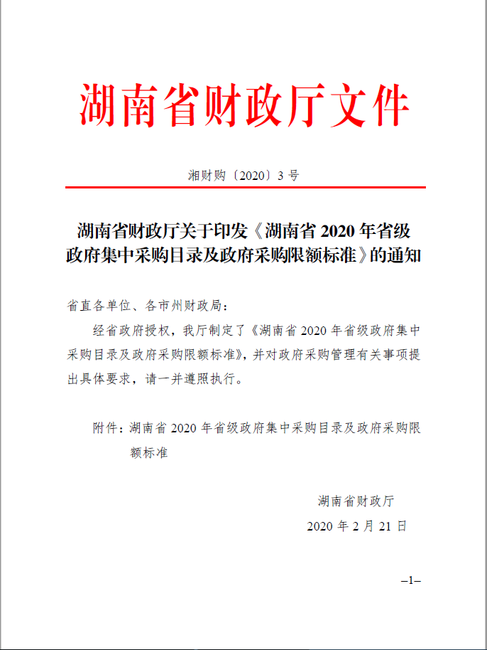 湖南省 2020 年省级政府集中采购目录及政府采购限额标准